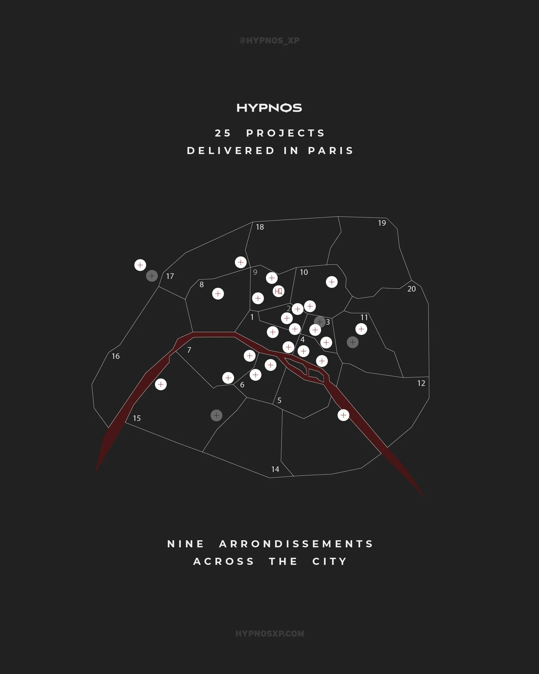 Since launching, HYPNOS has designed and delivered projects in 8 cities across France, 25 of which are in Paris.